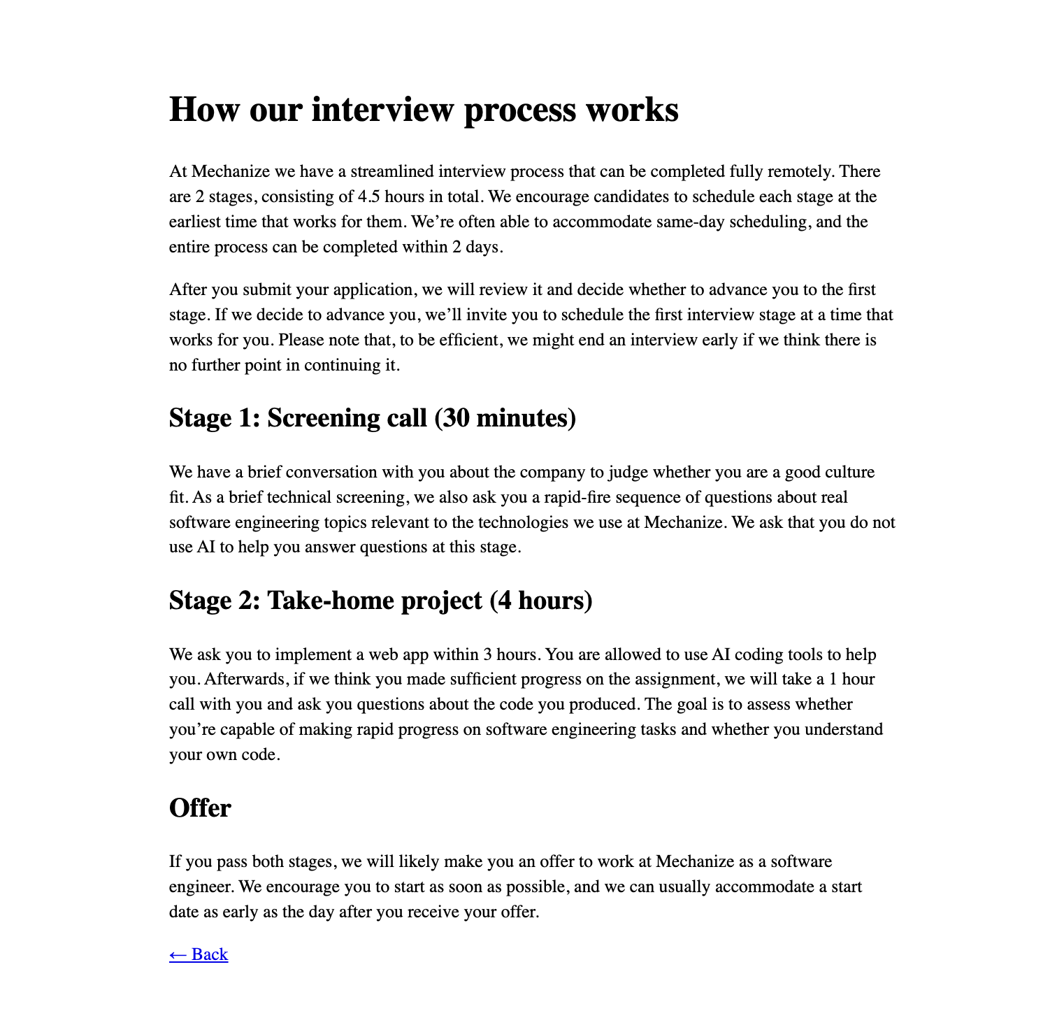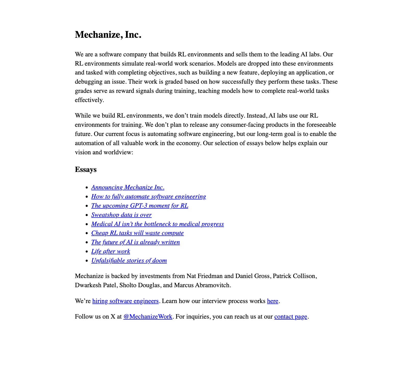 One thing about them to note- their website is bare bones. I'm talking single-column, left-aligned text, no navbar, no hero, serif typing, no CSS, actual white background (like #fff white, not off-white), pure black text. I completely understand that the brutalist design was intentional- they are a cutting edge company, they want to project that the styling doesn't matter- they are serious, they do real tech work.